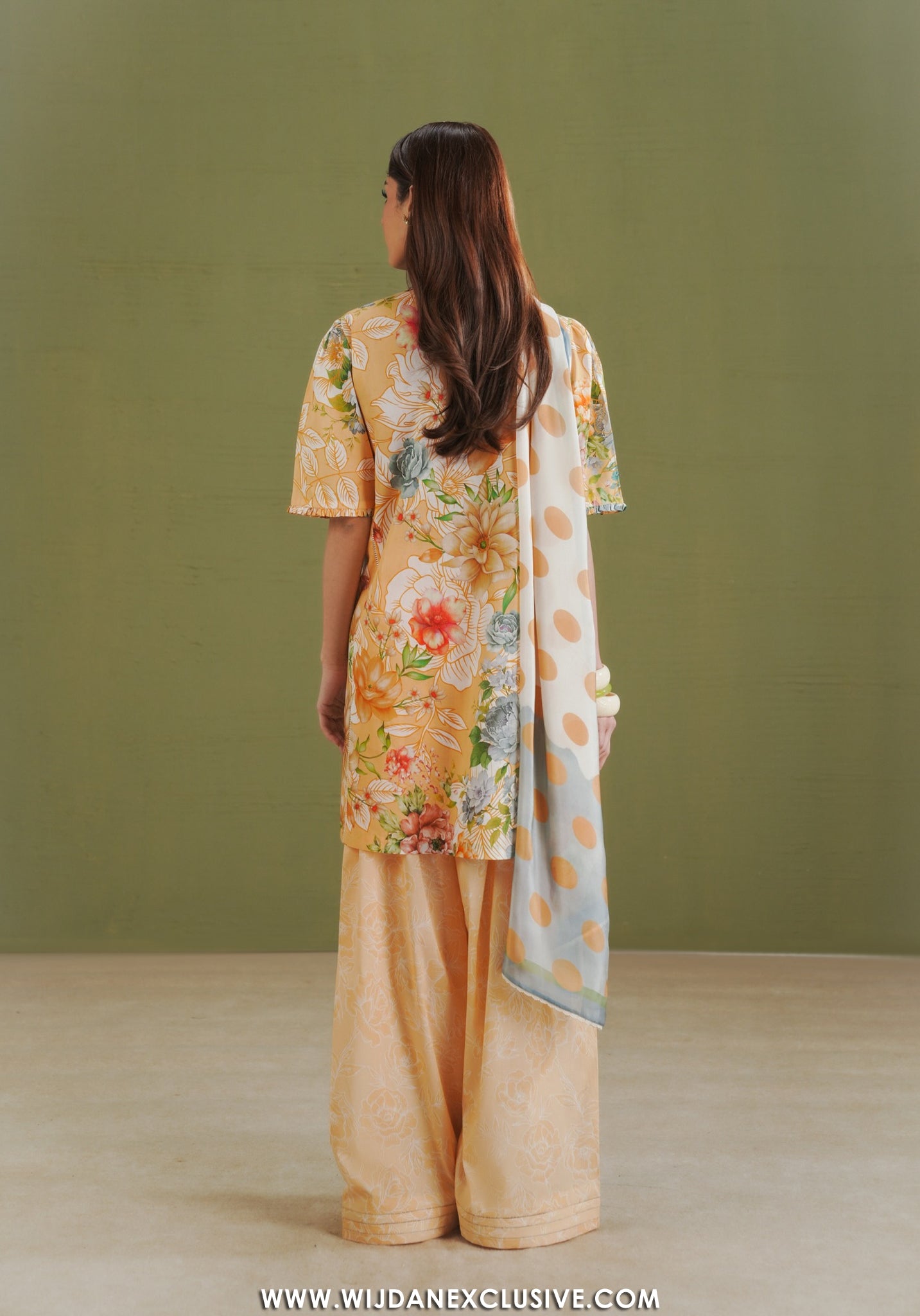 Wijdan Exclusive Store unveils this luminous Zara Shahjahan creation—a soft peach canvas adorned with oversized floral blooms in coral, yellow, and refreshing green tones that evoke a summer garden. The playful ivory dupatta with golden polka dots and sky blue borders adds contemporary charm and visual delight. Zara Shahjahan's artistic vision shines through in the harmonious color palette and the delicate lace detailing on the neckline and hem. Perfect for daytime celebrations and casual elegance, this breezy ensemble radiates warmth and effortless sophistication, capturing the essence of relaxed luxury with every thoughtfully crafted element.
