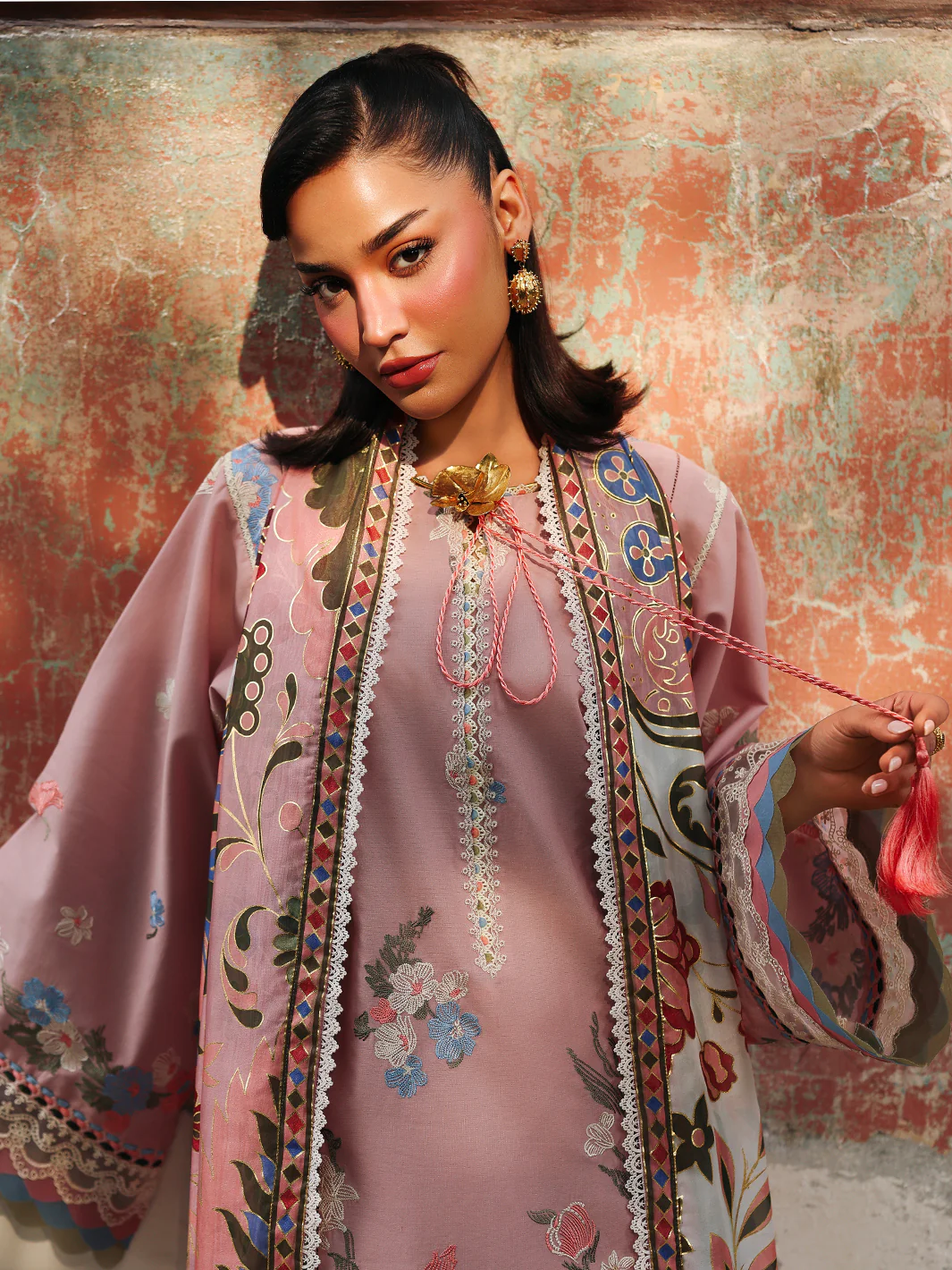Wijdan Exclusive Store unveils this charming Bin Ilyas ensemble—a soft blush pink canvas adorned with delicate scattered florals in soft blues and corals. The ornate embroidered neckline with tassel detail and striking artistic dupatta featuring bold color-blocked stripes and botanical motifs showcase exceptional creativity. Bin Ilyas delivers romantic artistry with every carefully considered detail, perfect for celebrating with contemporary flair and traditional grace.
