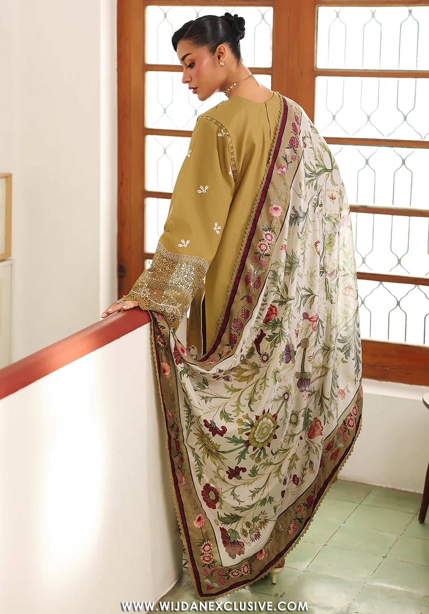 Wijdan Exclusive Store unveils this luxurious Bin Ilyas ensemble—a rich golden mustard canvas adorned with intricate ivory embroidery featuring traditional paisley motifs and delicate floral accents scattered throughout. The statement sleeves showcase elaborate golden sequin and embroidery work that catches the light beautifully, while the ornate border detailing adds regal sophistication. The elegant beige dupatta with vibrant botanical embroidery in pink, coral, and burgundy tones creates a stunning visual contrast. Bin Ilyas's exceptional craftsmanship shines through in the detailed neckline embellishments, the scalloped lace borders, and the harmonious blend of traditional artistry with contemporary elegance. Perfect for festive celebrations and special occasions, this ensemble radiates opulent charm and timeless luxury with every meticulously crafted element.