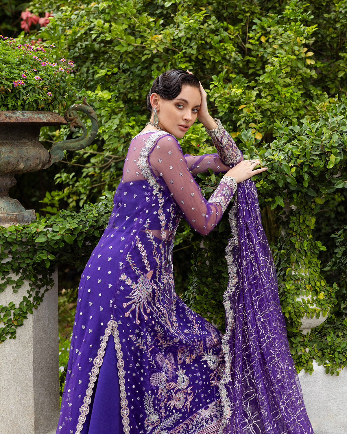 • Embroidered, sequined & hand embellished left panel (net)