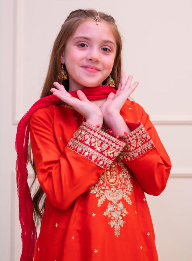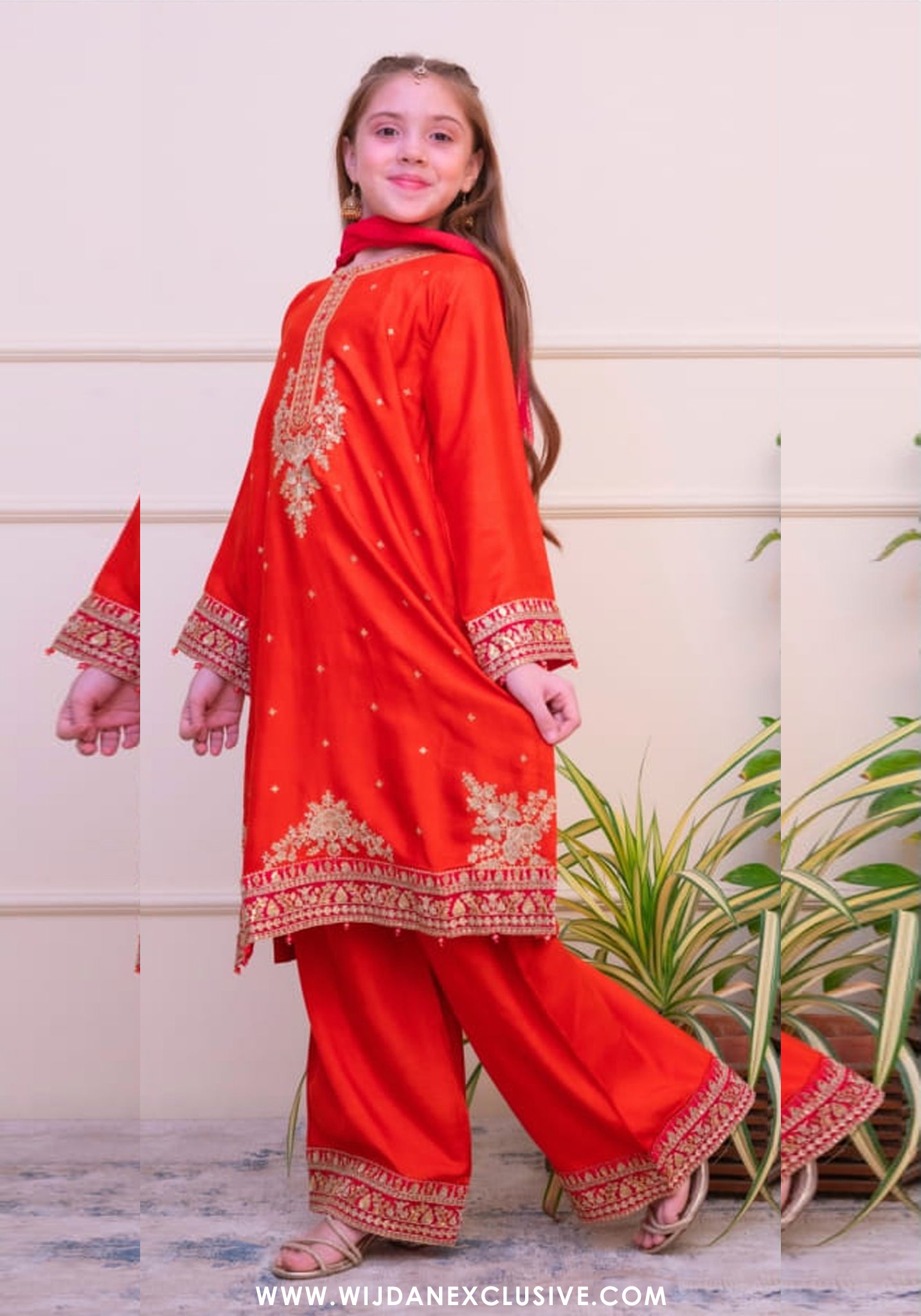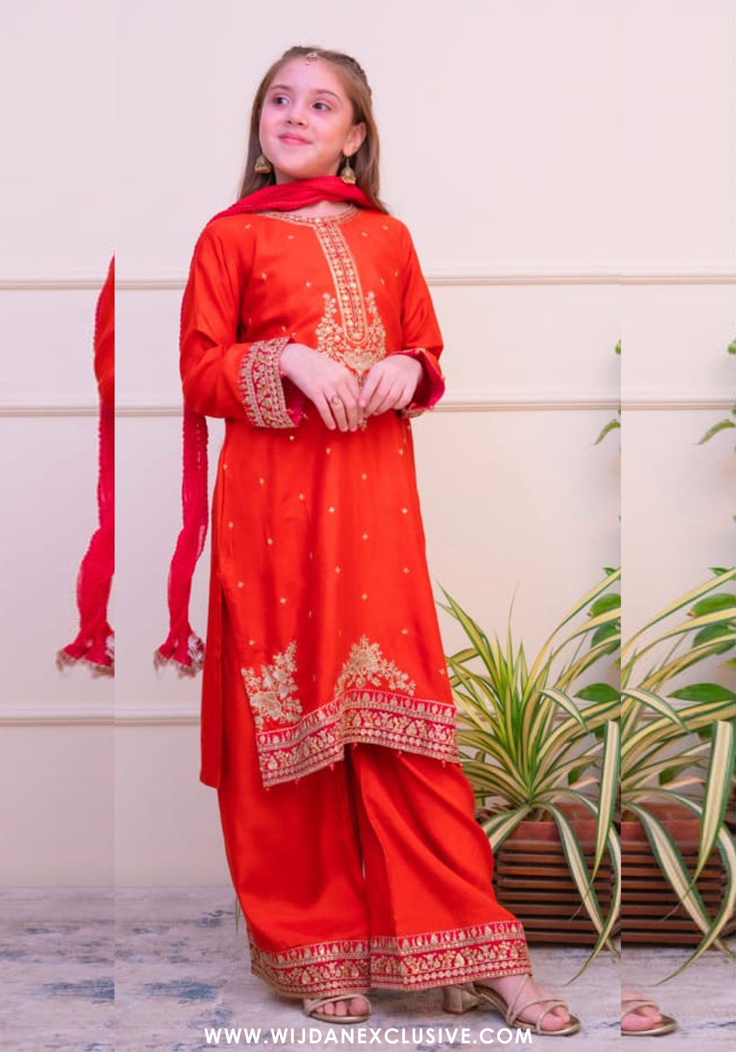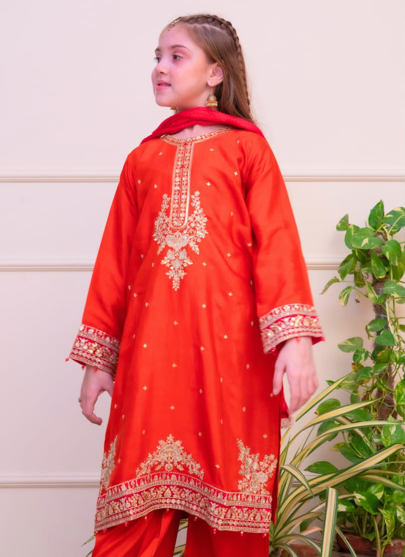 Embroidered and Embellished Raw Silk Shirt with Embroidered Culottes with Crushed Organza Dupatta