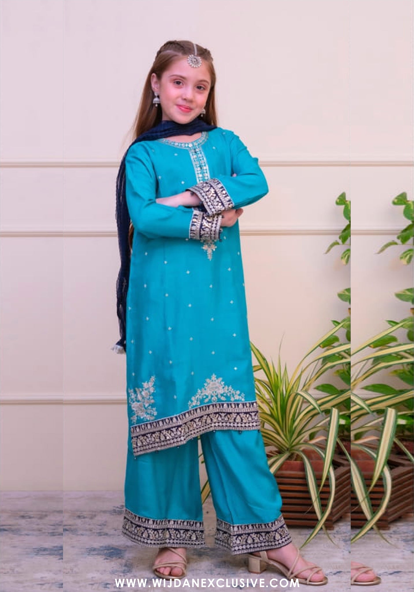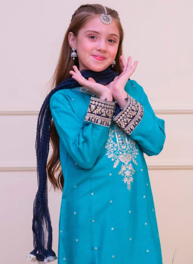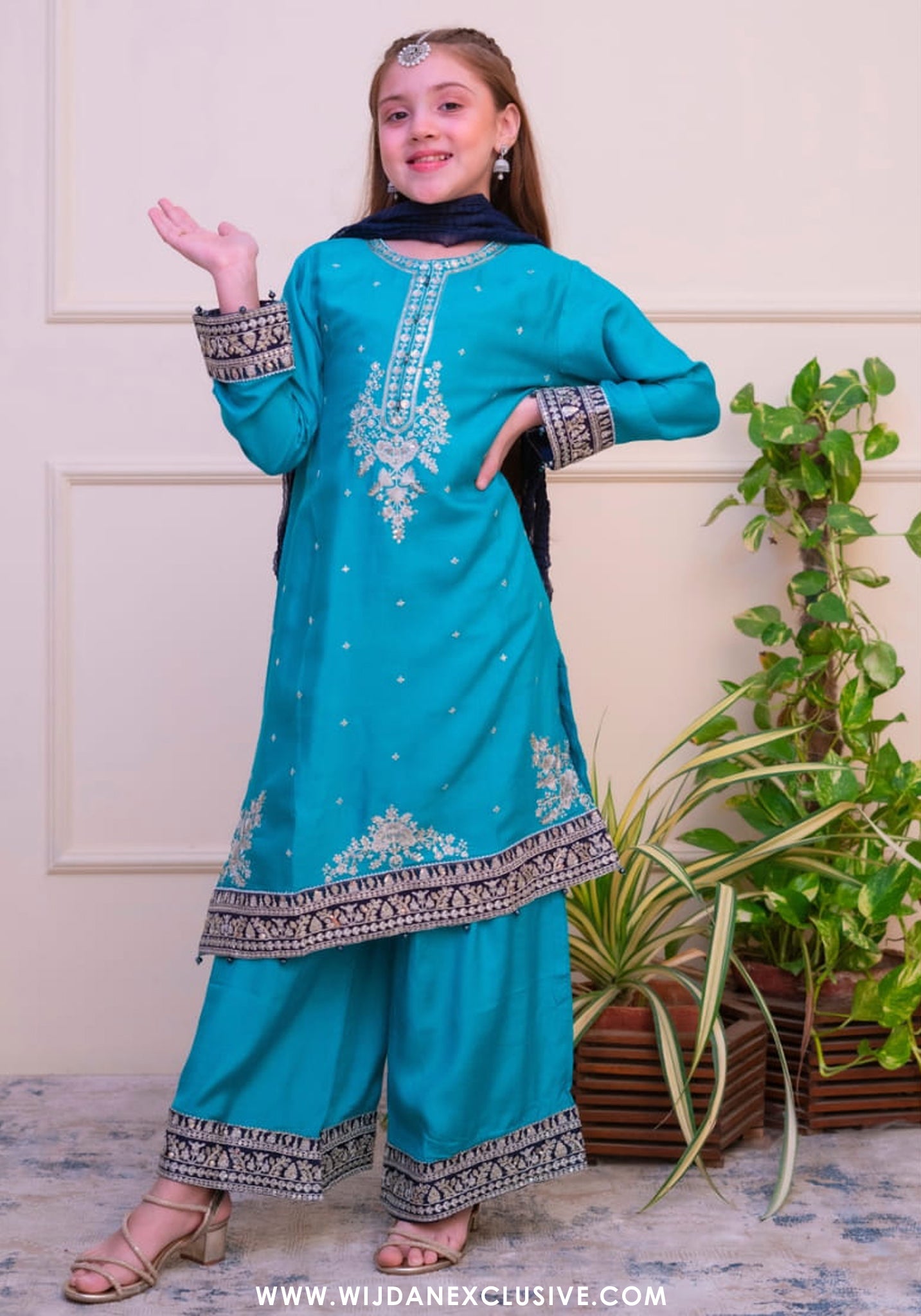 Embroidered and Embellished Raw Silk Shirt with Embroidered Culottes with Crushed Organza Dupatta